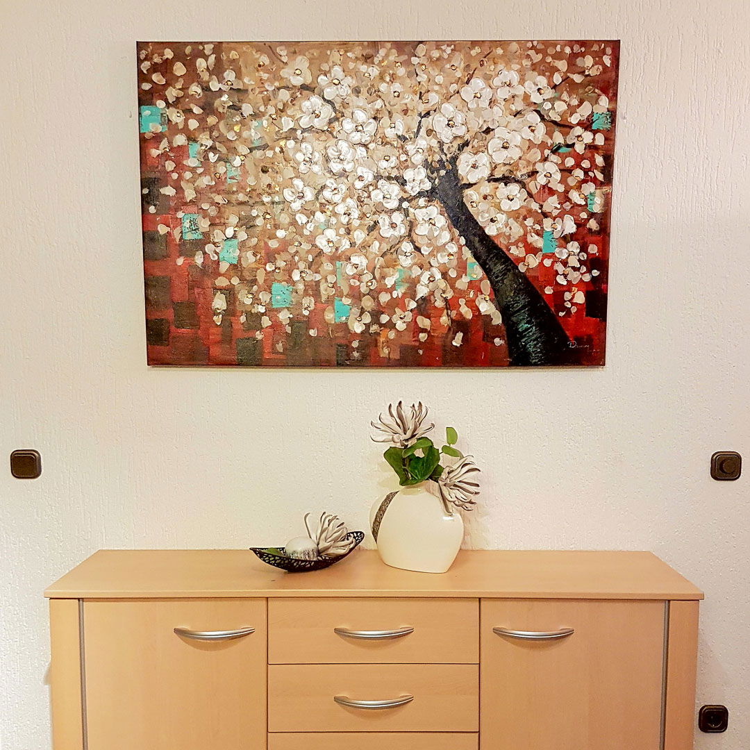 The painting 'Magic in the treetops' is hand-painted and signed by the artist Damon Meng, which makes it a unique piece of art. Especially in the living room or dining room, it will serve as an eye-catcher and delight your guests with its spring awakening. In addition, the acrylic painting is also the perfect gift for a loved one who cares about nature.