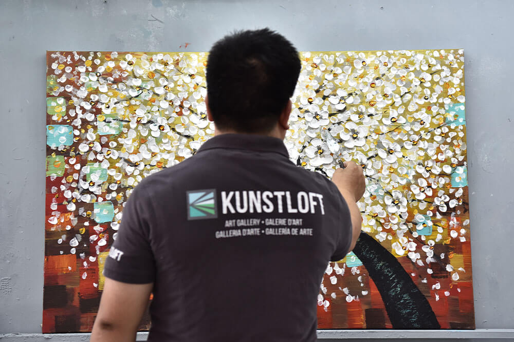 Die Acrylbilder von Damon Meng zeichnen sich durch eine beeindruckende Detailverliebtheit aus. Geboren und aufgewachsen in Peking, hatte er stets vor, eines Tages Maler zu werden. Allerdings konnte er sich nie mit der Großstadt anfreunden, unternahm gerne Wanderungen in die Natur und versuchte die Szenerie einzufangen, die sich ihm bot. Seit er sein Kunststudium abschloss, hat er schon an zahlreichen Kunstprojekten mitgewirkt und malt nun regelmäßig neue Gemälde für das KunstLoft. In seinen handgemalten Werken spiegelt sich seine Liebe für Mutter Natur wider. Mithilfe von schimmernden Gold- und Silbertönen sowie Metallicfarben gibt der Künstler seinen Bildern das gewisse Etwas. Er bezaubert Kunstliebhaber mit seinen eindrucksvollen Motiven von Blumen und blühenden Bäumen.