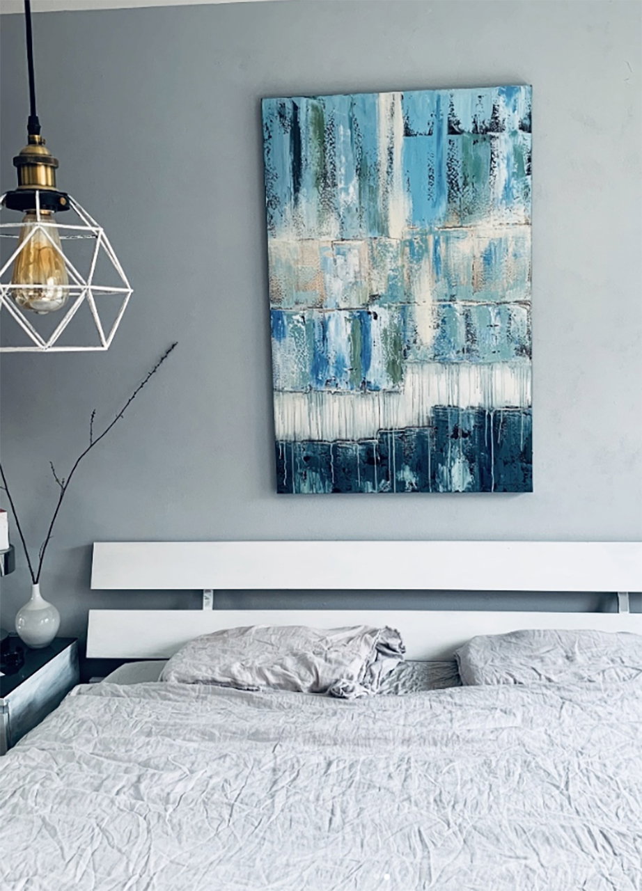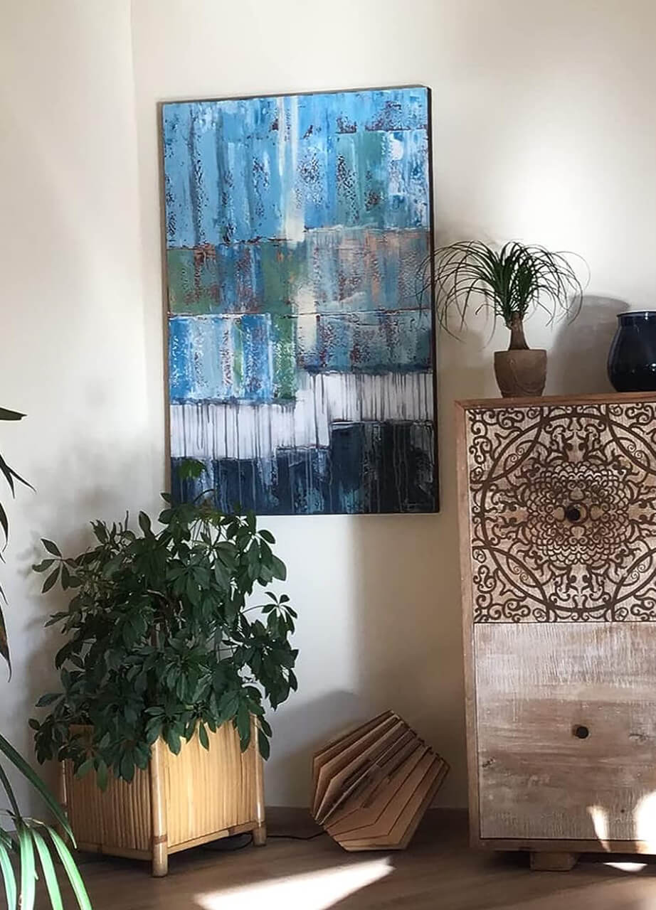 Das handgemalte Ölbild 'Tiefenentspannung' überwältigt mit der Ruhe, die es ausstrahlt. Verschiedenste Nuancen der Farbe Blau vereinen sich in diesem Kunstwerk. Für Akzente sorgen das Beige und Braun, welche sich zwischen den blauen Vierecken einreihen. Dieses Gemälde eignet sich ausgezeichnet als Ruhepol in Ihrem Büro oder Ihrer Praxis. Ihr handgemaltes Gemälde erhalten Sie in der Größe 80x120cm. Anders als bei minderwertigen Drucken auf Leinwand können Sie auf unseren Unikaten jeden Pinselstrich fühlen. 0 Oil painting 1 Ölgemälde Handmade Quality 2 2 0
