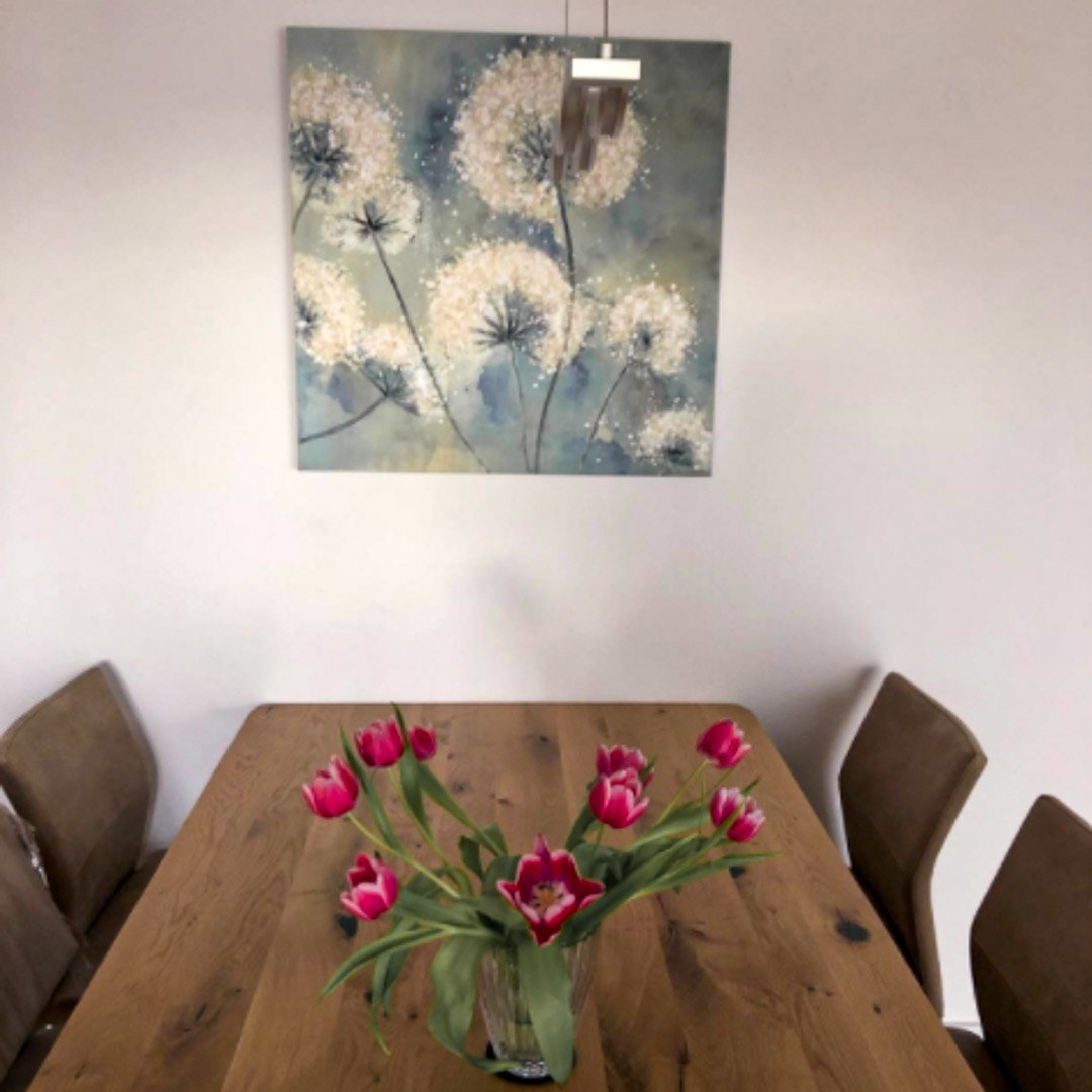 Die grauen Samen der verblühten Löwenzahnköpfe präsentieren sich zurückhaltend dem blauen Wind, um 'Durch Land und Zeit' geweht zu werden. Das Acrylgemälde überzeugt mit Feingefühl und Verzierungen aus Mixed-Media-Elementen und Glitter. Das Kunstwerk besitzt eine beruhigende Ausstrahlung, die sich unmittelbar in Ihrem Schlafzimmer ausbreiten wird. Ihr handgemaltes Gemälde erhalten Sie in der Größe 80x80cm. Anders als bei minderwertigen Drucken auf Leinwand können Sie auf unseren Unikaten jeden Pinselstrich fühlen. 0 Canvas pictures 1 Acrylgemälde Handmade Quality 2 2 0